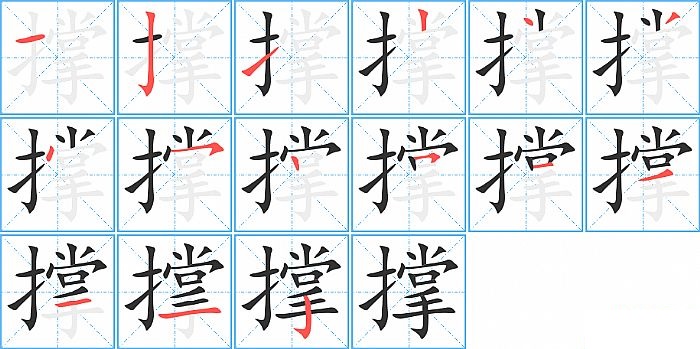 撑是左右结构,撑的部首是“扌”,部外笔画12画,总笔画15画,撑的笔画顺序是“横、竖钩、提、竖、点、撇、点、横撇/横钩、竖、横折、横、撇、横、横、竖钩”。看看“撑”字什么意思 >>