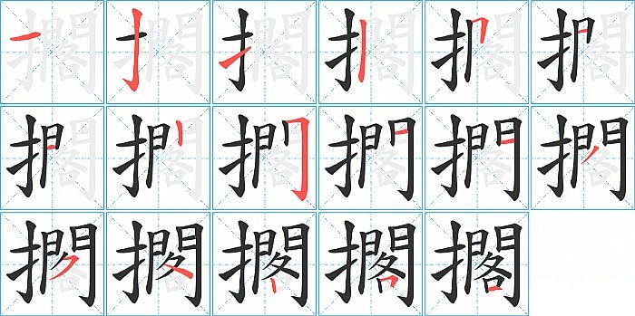 擱是左右结构,擱的部首是“扌”,部外笔画14画,总笔画17画,擱的笔画顺序是“横、竖钩、提、横折、横、横、竖、竖、横折钩、横、横、撇、横撇/横钩、捺、竖、横折、横”。看看“擱”字什么意思 >>