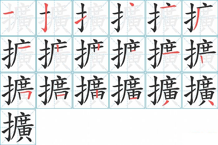 擴是左右结构,擴的部首是“扌”,部外笔画14画,总笔画17画,擴的笔画顺序是“横、竖钩、提、点、横、撇、横、竖、竖、横、竖、横折、横、竖、横、撇、点”。看看“擴”字什么意思 >>