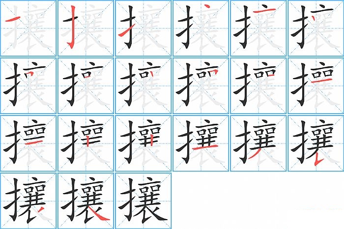 攘是左右结构,攘的部首是“扌”,部外笔画17画,总笔画20画,攘的笔画顺序是“横、竖钩、提、点、横、竖、横折、横、竖、横折、横、横、横、竖、竖、横、撇、竖提、撇、捺”。看看“攘”字什么意思 >>