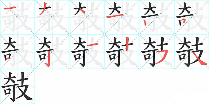 攲是左右结构,攲的部首是“支”,部外笔画8画,总笔画12画,攲的笔画顺序是“横、撇、点、横、竖、横折、横、竖钩、横、竖、横撇/横钩、捺”。看看“攲”字什么意思 >>