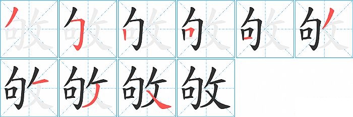 敂是左右结构,敂的部首是“攵”,部外笔画5画,总笔画9画,敂的笔画顺序是“撇、横折钩、竖、横折、横、撇、横、撇、捺”。