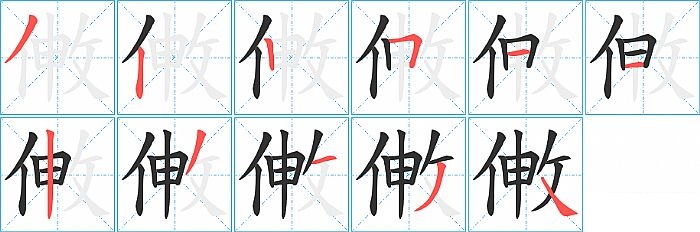 敒是左右结构,敒的部首是“攵”,部外笔画7画,总笔画11画,敒的笔画顺序是“撇、竖、竖、横折、横、横、竖、撇、横、撇、捺”。看看“敒”字什么意思 >>