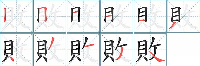 敗是左右结构,敗的部首是“攵”,部外笔画7画,总笔画11画,敗的笔画顺序是“竖、横折、横、横、横、撇、点、撇、横、撇、捺”。看看“敗”字什么意思 >>
