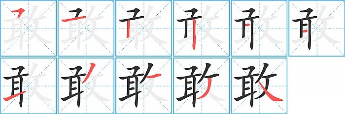 敢是左右结构,敢的部首是“攵”,部外笔画7画,总笔画11画,敢的笔画顺序是“横撇/横钩、横、竖、竖、横、横、提、撇、横、撇、捺”。看看“敢”字什么意思 >>
