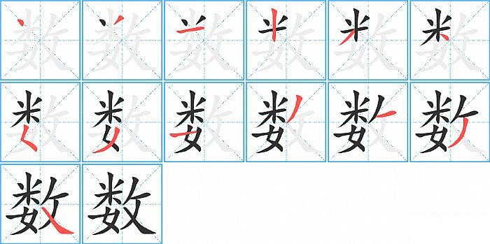 数是左右结构,数的部首是“攵”,部外笔画9画,总笔画13画,数的笔画顺序是“点、撇、横、竖、撇、点、撇点、撇、横、撇、横、撇、捺”。看看“数”字什么意思 >>