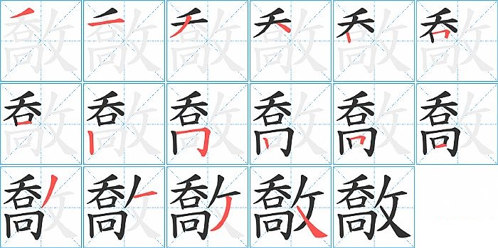 敿是左右结构,敿的部首是“攵”,部外笔画12画,总笔画16画,敿的笔画顺序是“撇、横、撇、点、竖、横折、横、竖、横折钩、竖、横折、横、撇、横、撇、捺”。看看“敿”字什么意思 >>