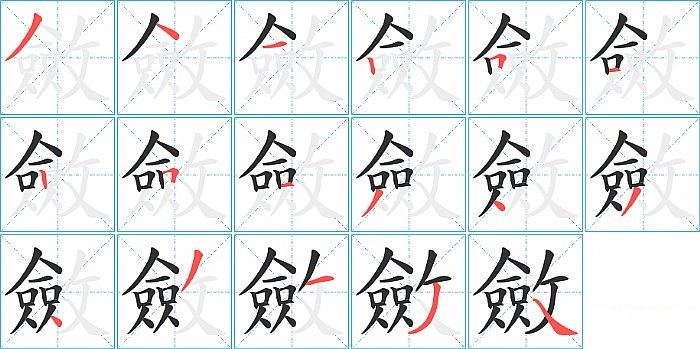斂是左右结构,斂的部首是“攵”,部外笔画13画,总笔画17画,斂的笔画顺序是“撇、点、横、竖、横折、横、竖、横折、横、撇、点、撇、点、撇、横、撇、捺”。看看“斂”字什么意思 >>