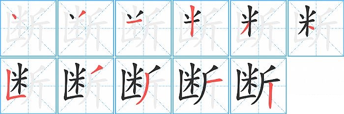 断是左右结构,断的部首是“斤”,部外笔画7画,总笔画11画,断的笔画顺序是“点、撇、横、竖、撇、点、竖折/竖弯、撇、撇、横、竖”。看看“断”字什么意思 >>