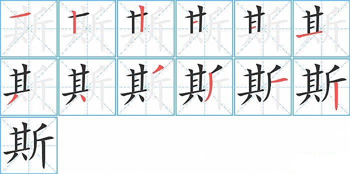 斯是左右结构,斯的部首是“斤”,部外笔画8画,总笔画12画,斯的笔画顺序是“横、竖、竖、横、横、横、撇、点、撇、撇、横、竖”。看看“斯”字什么意思 >>