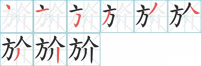 斺是左右结构,斺的部首是“方”,部外笔画4画,总笔画8画,斺的笔画顺序是“点、横、横折钩、撇、撇、捺、撇、竖”。