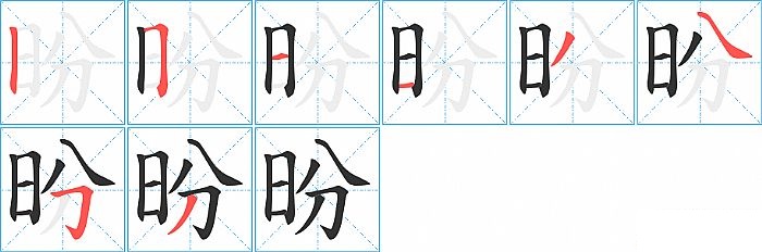 昐是左右结构,昐的部首是“日”,部外笔画4画,总笔画8画,昐的笔画顺序是“竖、横折、横、横、撇、捺、横折钩、撇”。