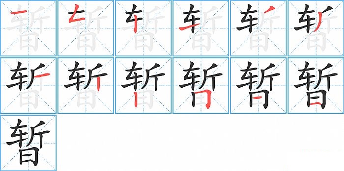 暂是上下结构,暂的部首是“日”,部外笔画8画,总笔画12画,暂的笔画顺序是“横、撇折、竖、提、撇、撇、横、竖、竖、横折、横、横”。看看“暂”字什么意思 >>