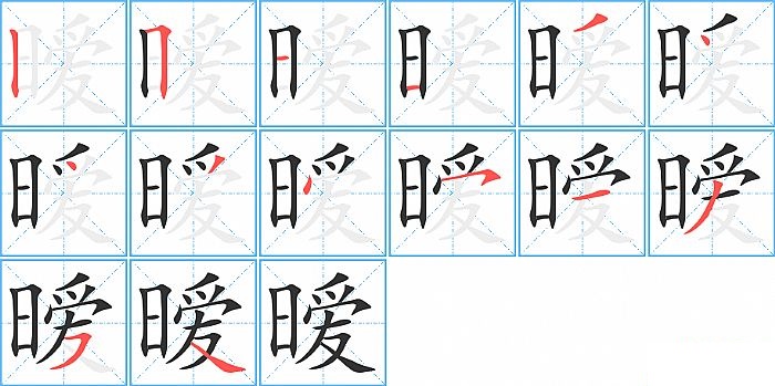 暧是左右结构,暧的部首是“日”,部外笔画10画,总笔画14画,暧的笔画顺序是“竖、横折、横、横、撇、点、点、撇、点、横撇/横钩、横、撇、横撇/横钩、捺”。看看“暧”字什么意思 >>