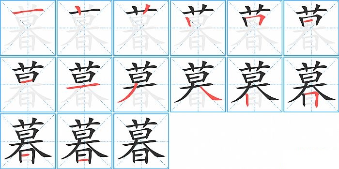 暮是上下结构,暮的部首是“日”,部外笔画10画,总笔画14画,暮的笔画顺序是“横、竖、竖、竖、横折、横、横、横、撇、捺、竖、横折、横、横”。看看“暮”字什么意思 >>