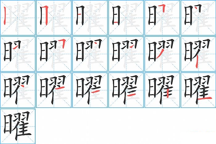 曜是左右结构,曜的部首是“日”,部外笔画14画,总笔画18画,曜的笔画顺序是“竖、横折、横、横、横折、点、提、横折、点、提、撇、竖、点、横、横、横、竖、横”。看看“曜”字什么意思 >>