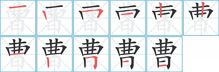 曹是上下结构,曹的部首是“曰”,部外笔画7画,总笔画11画,曹的笔画顺序是“横、竖、横折、横、竖、竖、横、竖、横折、横、横”。看看“曹”字什么意思 >>