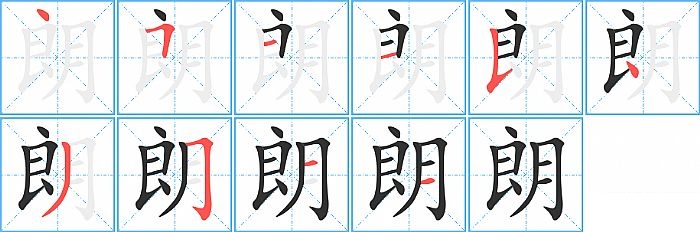 朗是左右结构,朗的部首是“月”,部外笔画6画,总笔画10画,朗的笔画顺序是“点、横折、横、横、竖提、点、撇、横折钩、横、横”。看看“朗”字什么意思 >>