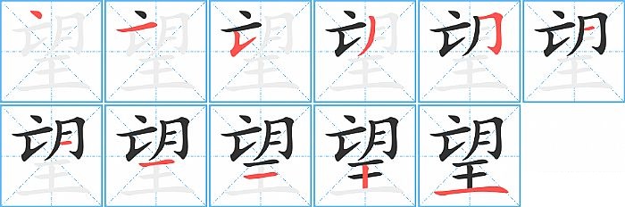 望是上下结构,望的部首是“月”,部外笔画7画,总笔画11画,望的笔画顺序是“点、横、竖提、撇、横折钩、横、横、横、横、竖、横”。看看“望”字什么意思 >>