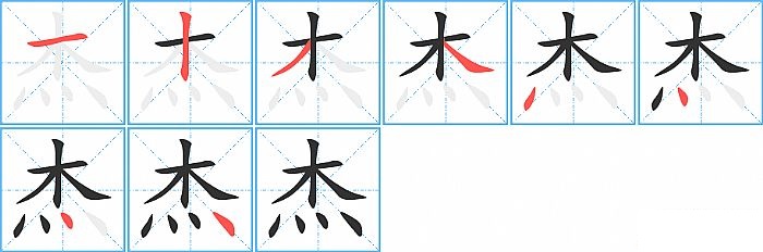 杰是上下结构,杰的部首是“木”,部外笔画4画,总笔画8画,杰的笔画顺序是“横、竖、撇、捺、点、点、点、点”。