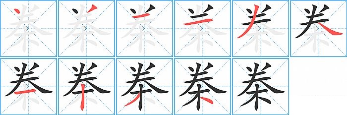 桊是上下结构,桊的部首是“木”,部外笔画6画,总笔画10画,桊的笔画顺序是“点、撇、横、横、撇、捺、横、竖、撇、捺”。