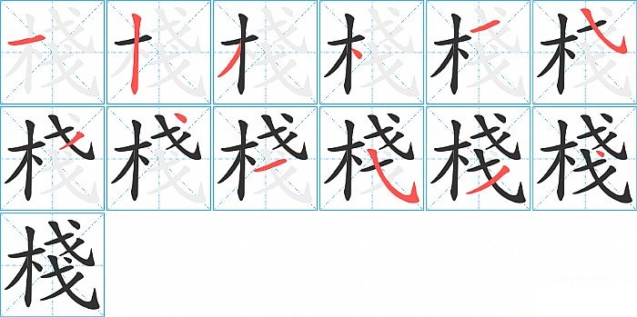 棧是左右结构,棧的部首是“木”,部外笔画8画,总笔画12画,棧的笔画顺序是“横、竖、撇、点、横、斜钩、撇、点、横、斜钩、撇、点”。看看“棧”字什么意思 >>