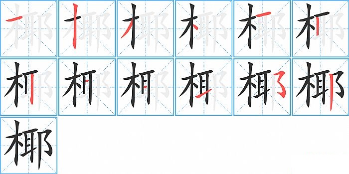 椰是左中右结构,椰的部首是“木”,部外笔画8画,总笔画12画,椰的笔画顺序是“横、竖、撇、点、横、竖、竖、横、横、提、横折折折钩/横撇弯钩、竖”。看看“椰”字什么意思 >>