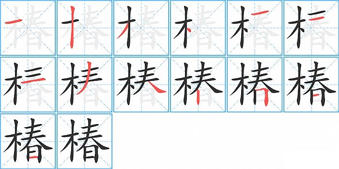 椿是左右结构,椿的部首是“木”,部外笔画9画,总笔画13画,椿的笔画顺序是“横、竖、撇、点、横、横、横、撇、捺、竖、横折、横、横”。看看“椿”字什么意思 >>