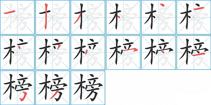 榜是左右结构,榜的部首是“木”,部外笔画10画,总笔画14画,榜的笔画顺序是“横、竖、撇、点、点、横、点、撇、点、横撇/横钩、点、横、横折钩、撇”。看看“榜”字什么意思 >>