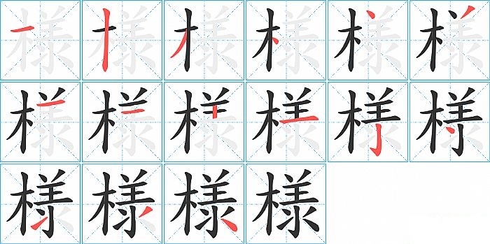 様是左右结构,様的部首是“木”,部外笔画10画,总笔画14画,様的笔画顺序是“横、竖、撇、点、点、撇、横、横、竖、横、竖钩、横撇/横钩、撇、捺”。看看“様”字什么意思 >>