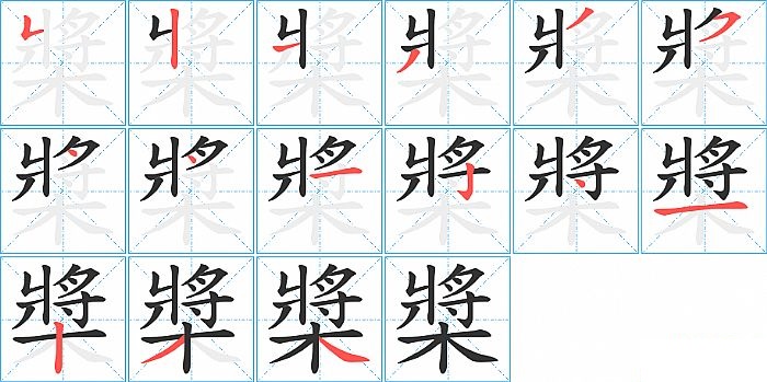槳是上下结构,槳的部首是“木”,部外笔画11画,总笔画15画,槳的笔画顺序是“竖折/竖弯、竖、横、撇、撇、横撇/横钩、点、点、横、竖钩、点、横、竖、撇、捺”。看看“槳”字什么意思 >>