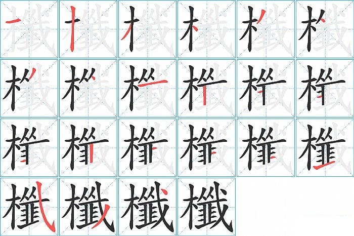 櫼是左右结构,櫼的部首是“木”,部外笔画17画,总笔画21画,櫼的笔画顺序是“横、竖、撇、点、撇、点、撇、点、横、竖、横、横、横、竖、横、横、横、提、斜钩、撇、点”。看看“櫼”字什么意思 >>