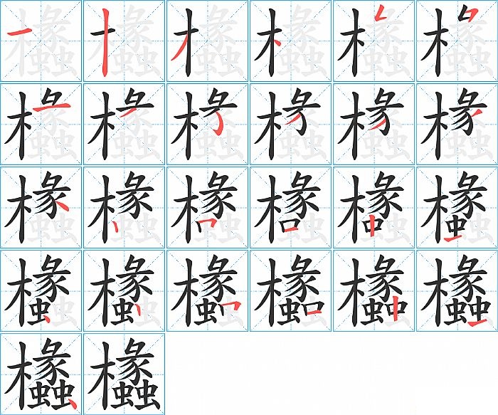 欚是左右结构,欚的部首是“木”,部外笔画21画,总笔画25画,欚的笔画顺序是“横、竖、撇、点、撇折、横撇/横钩、横、撇、弯钩、撇、撇、撇、捺、竖、横折、横、竖、横、点、竖、横折、横、竖、横、点”。看看“欚”字什么意思 >>
