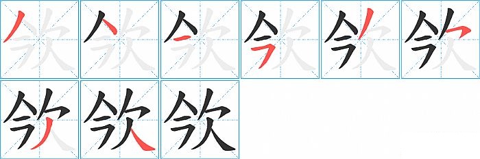 欦是左右结构,欦的部首是“欠”,部外笔画4画,总笔画8画,欦的笔画顺序是“撇、点、点、横撇/横钩、撇、横撇/横钩、撇、捺”。看看“欦”字什么意思 >>