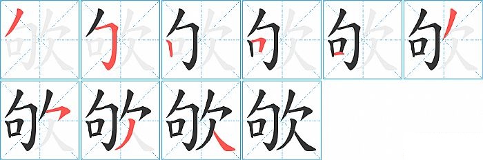 欨是左右结构,欨的部首是“欠”,部外笔画5画,总笔画9画,欨的笔画顺序是“撇、横折钩、竖、横折、横、撇、横撇/横钩、撇、捺”。看看“欨”字什么意思 >>