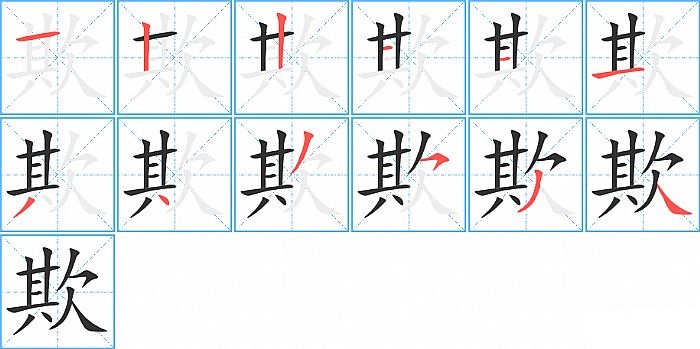 欺是左右结构,欺的部首是“欠”,部外笔画8画,总笔画12画,欺的笔画顺序是“横、竖、竖、横、横、横、撇、点、撇、横撇/横钩、撇、捺”。看看“欺”字什么意思 >>