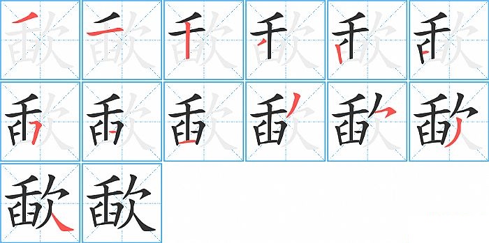 歃是左右结构,歃的部首是“欠”,部外笔画9画,总笔画13画,歃的笔画顺序是“撇、横、竖、撇、竖、横、横折、横、横、撇、横撇/横钩、撇、捺”。看看“歃”字什么意思 >>
