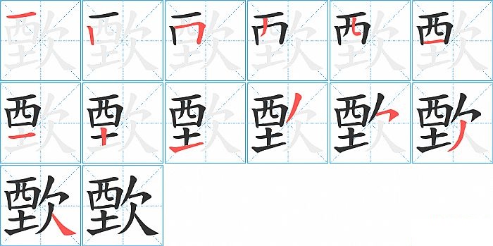 歅是左右结构,歅的部首是“欠”,部外笔画9画,总笔画13画,歅的笔画顺序是“横、竖、横折、竖、竖、横、横、竖、提、撇、横撇/横钩、撇、捺”。看看“歅”字什么意思 >>