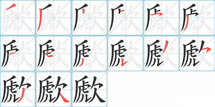 歋是左右结构,歋的部首是“欠”,部外笔画10画,总笔画14画,歋的笔画顺序是“撇、撇、竖、横、横撇/横钩、撇、横、竖弯钩、撇、横折提、撇、横撇/横钩、撇、捺”。看看“歋”字什么意思 >>