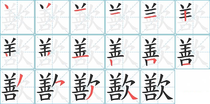 歚是左右结构,歚的部首是“欠”,部外笔画12画,总笔画16画,歚的笔画顺序是“点、撇、横、横、横、竖、点、撇、横、竖、横折、横、撇、横撇/横钩、撇、捺”。看看“歚”字什么意思 >>