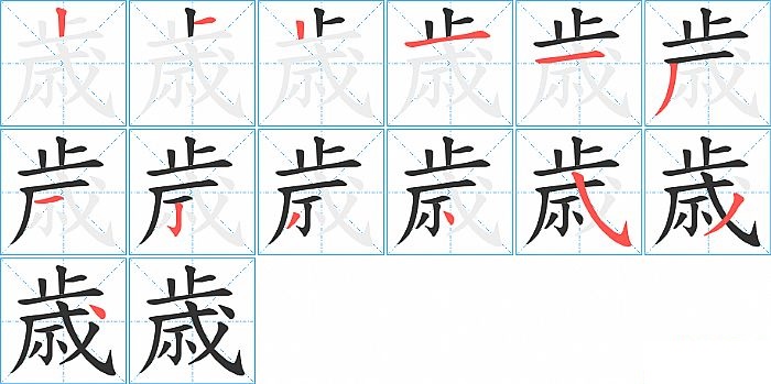 歳是上下结构,歳的部首是“止”,部外笔画9画,总笔画13画,歳的笔画顺序是“竖、横、竖、横、横、撇、横、竖钩、撇、点、斜钩、撇、点”。看看“歳”字什么意思 >>