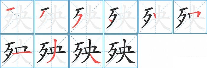 殃是左右结构,殃的部首是“歹”,部外笔画5画,总笔画9画,殃的笔画顺序是“横、撇、横撇/横钩、点、竖、横折、横、撇、捺”。