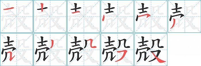 殻是左右结构,殻的部首是“殳”,部外笔画7画,总笔画11画,殻的笔画顺序是“横、竖、横、点、横撇/横钩、撇、横折提、撇、横折折/横折弯、横撇/横钩、捺”。看看“殻”字什么意思 >>