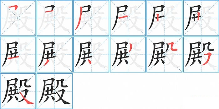 殿是左右结构,殿的部首是“殳”,部外笔画9画,总笔画13画,殿的笔画顺序是“横折、横、撇、横、竖、竖、横、撇、点、撇、横折折/横折弯、横撇/横钩、捺”。看看“殿”字什么意思 >>
