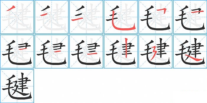 毽是半包围结构,毽的部首是“毛”,部外笔画8画,总笔画12画,毽的笔画顺序是“撇、横、横、竖弯钩、横折、横、横、横、横、竖、横折折撇、捺”。看看“毽”字什么意思 >>