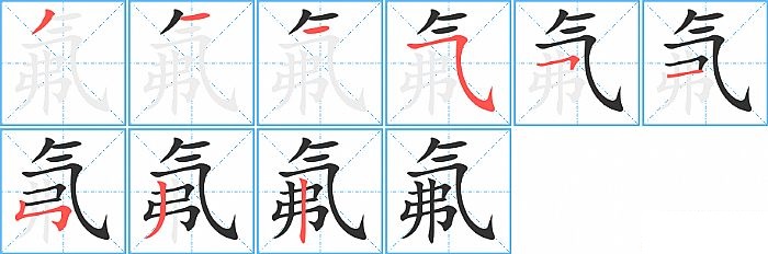 氟是半包围结构,氟的部首是“气”,部外笔画5画,总笔画9画,氟的笔画顺序是“撇、横、横、横折弯钩/横斜钩、横折、横、竖折折钩、撇、竖”。看看“氟”字什么意思 >>