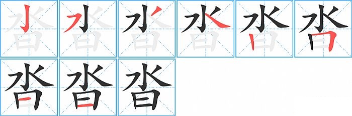 沓是上下结构,沓的部首是“水”,部外笔画4画,总笔画8画,沓的笔画顺序是“竖钩、横撇/横钩、撇、捺、竖、横折、横、横”。