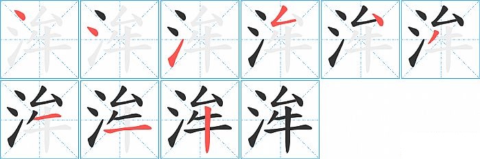 洠是左右结构,洠的部首是“氵”,部外笔画6画,总笔画9画,洠的笔画顺序是“点、点、提、撇折、点、撇、横、横、竖”。