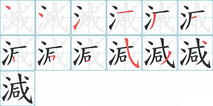 減是左右结构,減的部首是“氵”,部外笔画9画,总笔画12画,減的笔画顺序是“点、点、提、横、撇、横、竖、横折、横、斜钩、撇、点”。看看“減”字什么意思 >>