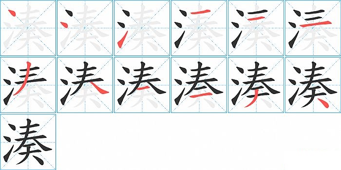 湊是左右结构,湊的部首是“氵”,部外笔画9画,总笔画12画,湊的笔画顺序是“点、点、提、横、横、横、撇、捺、横、横、撇、点”。看看“湊”字什么意思 >>